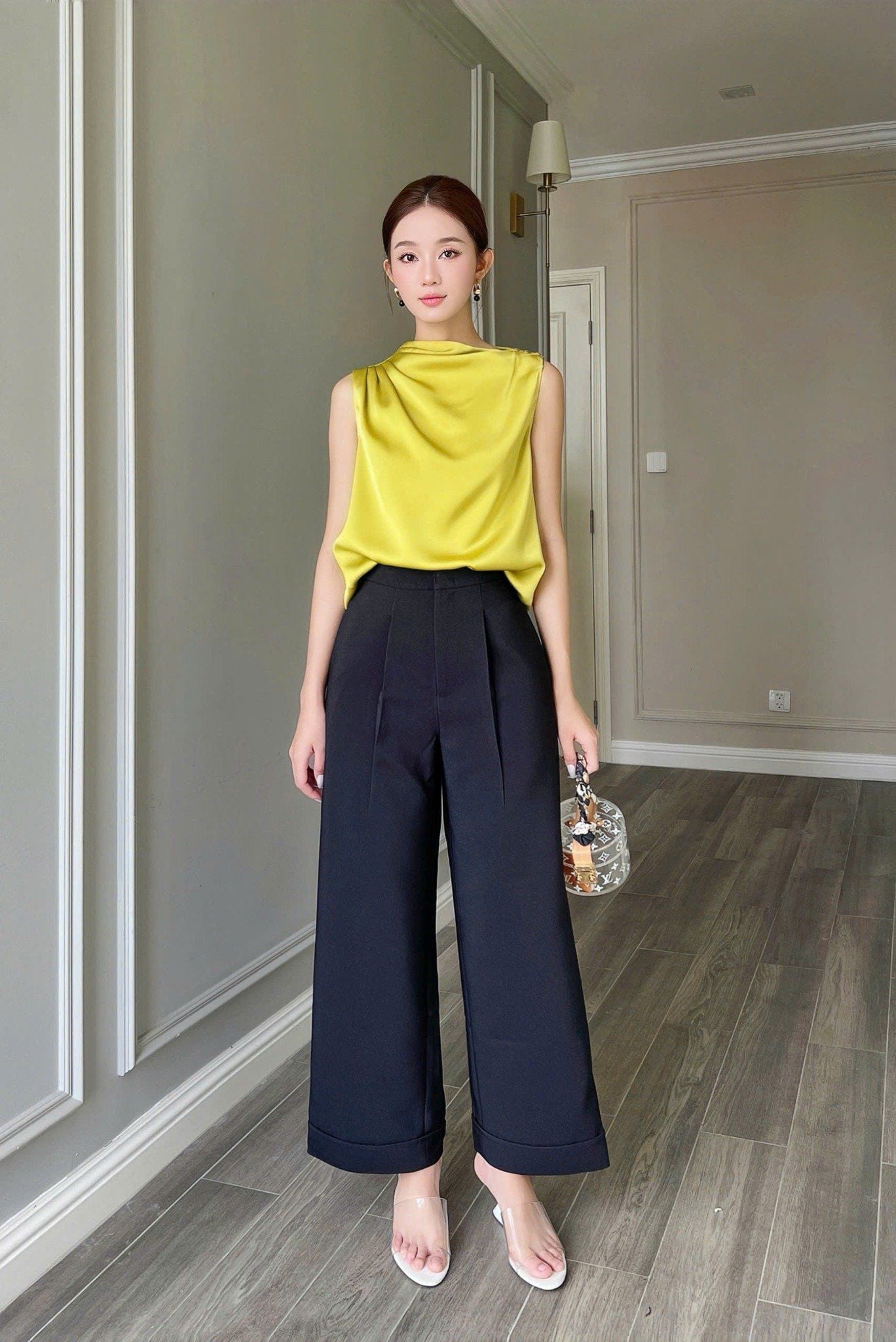 - Áo sát nách cổ lệch xếp ly Vàng chanh