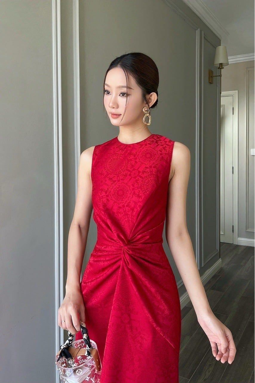 Đầm sát nách xoắn eo gấm Đỏ