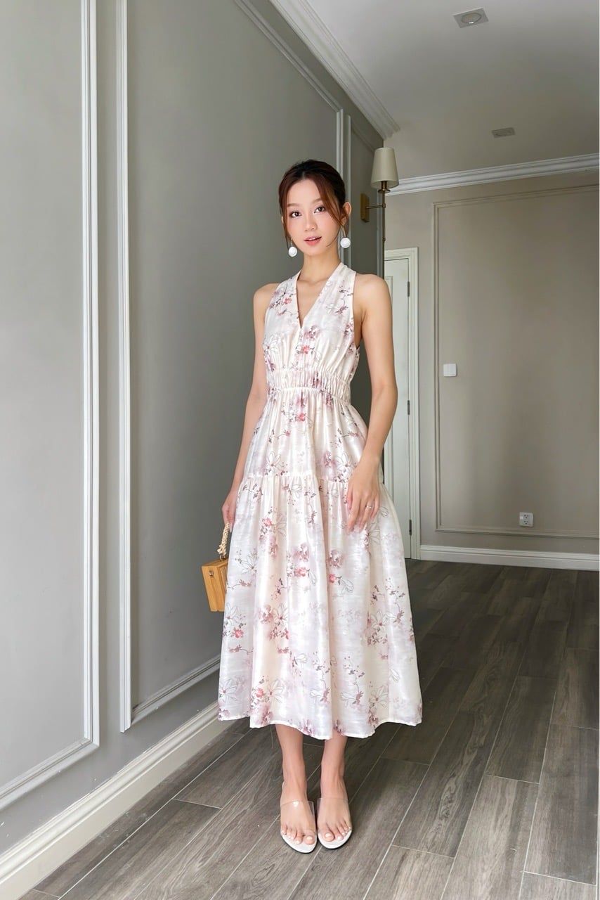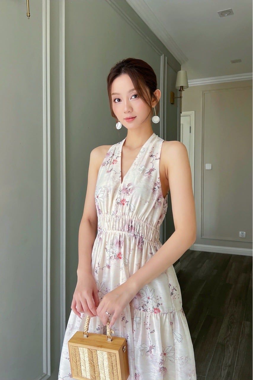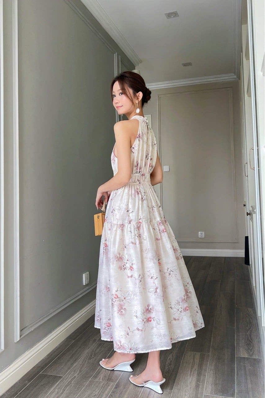(MỚI) Đầm yếm chít li vai maxi phối nhíu hoa kem